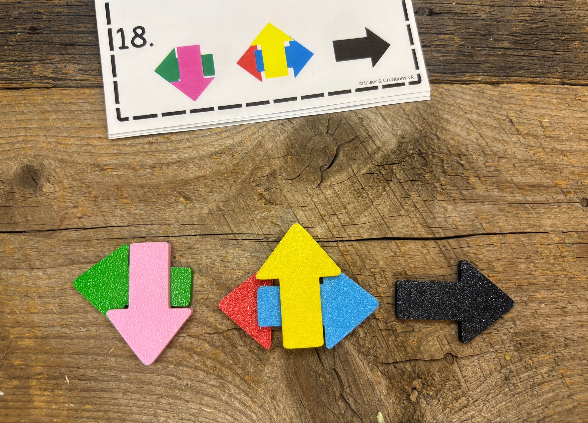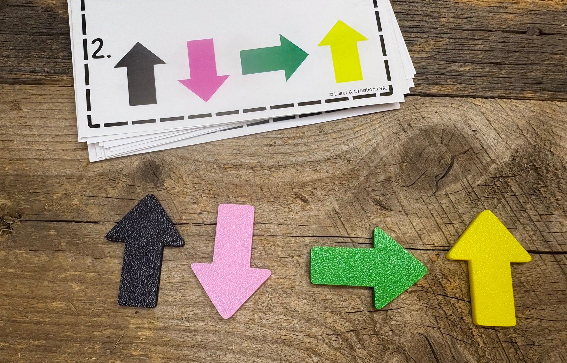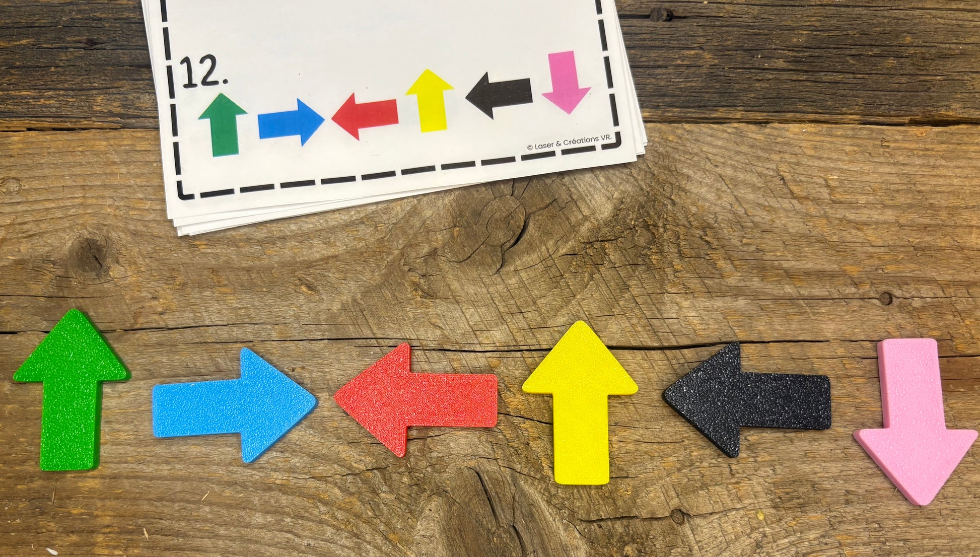 L’activité consiste à reproduire des séquences de flèches en respectant à la fois leur couleur et leur orientation. Les enfants observent les cartes modèles puis positionnent les flèches physiques correspondantes.