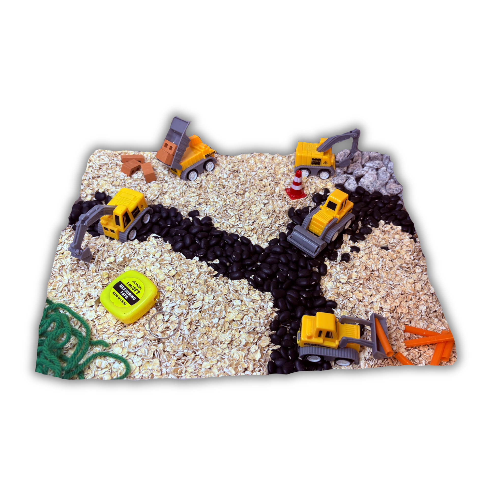 -Déposer les flocons d'avoine au fond du bac, puis ajouter les objets.