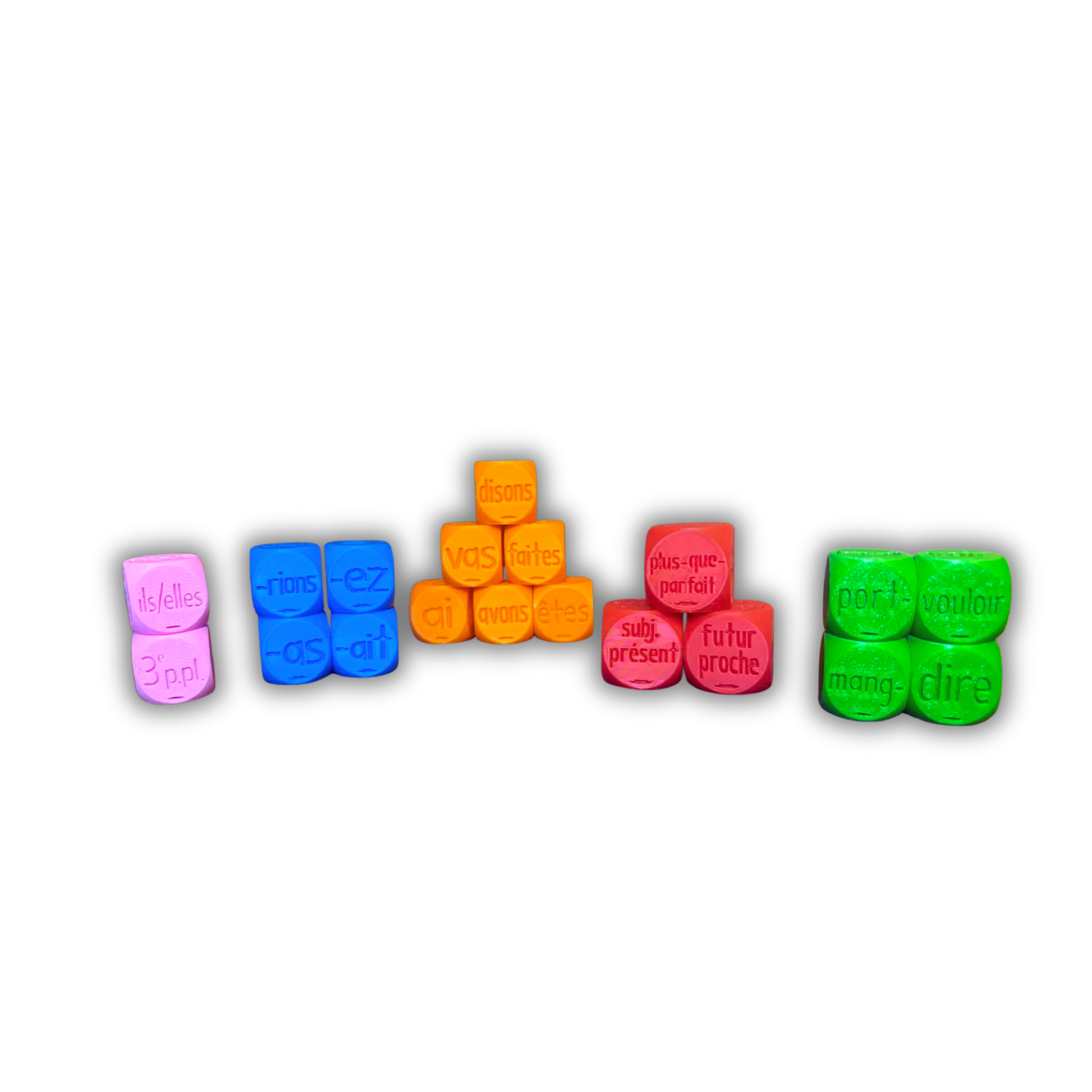 Chaque dé représente un élément clé (pronoms, terminaisons, temps, verbes, radicaux…), permettant aux élèves de créer, analyser et manipuler des formes verbales de manière simple et ludique.