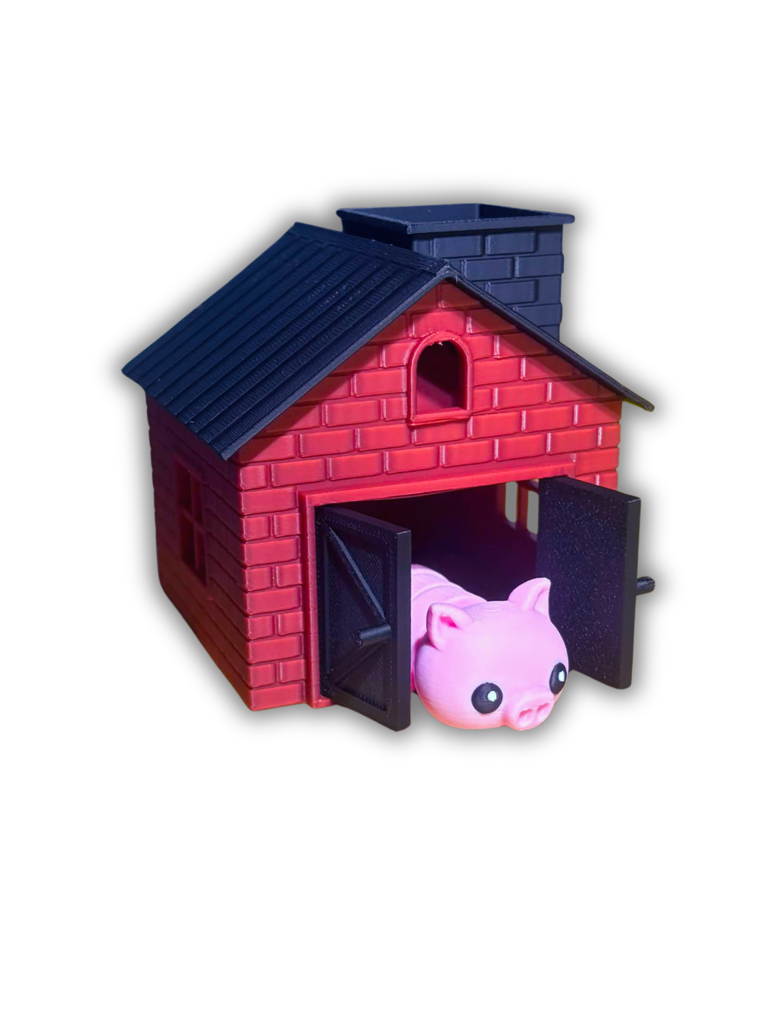 Les portes s'ouvrent et se ferment. Le toit peut également s'enlever... La cheminée est assez grande pour que le loup entre et se brûle le popotin sur le feu ;) !