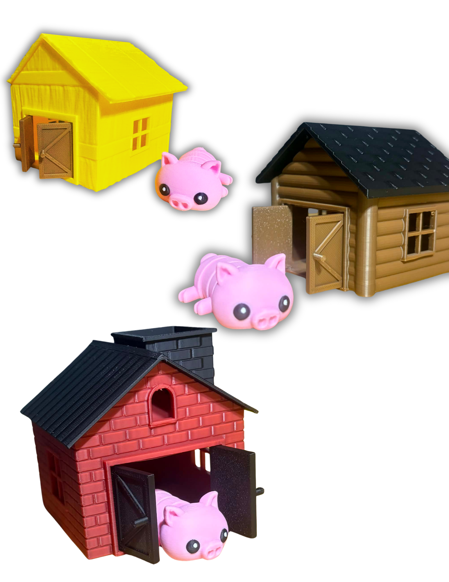 Lot complet des 3 petits cochons : 3 maisons (paille/bois/brique), 3 cochons flexibles, 1 loup, 1 feu