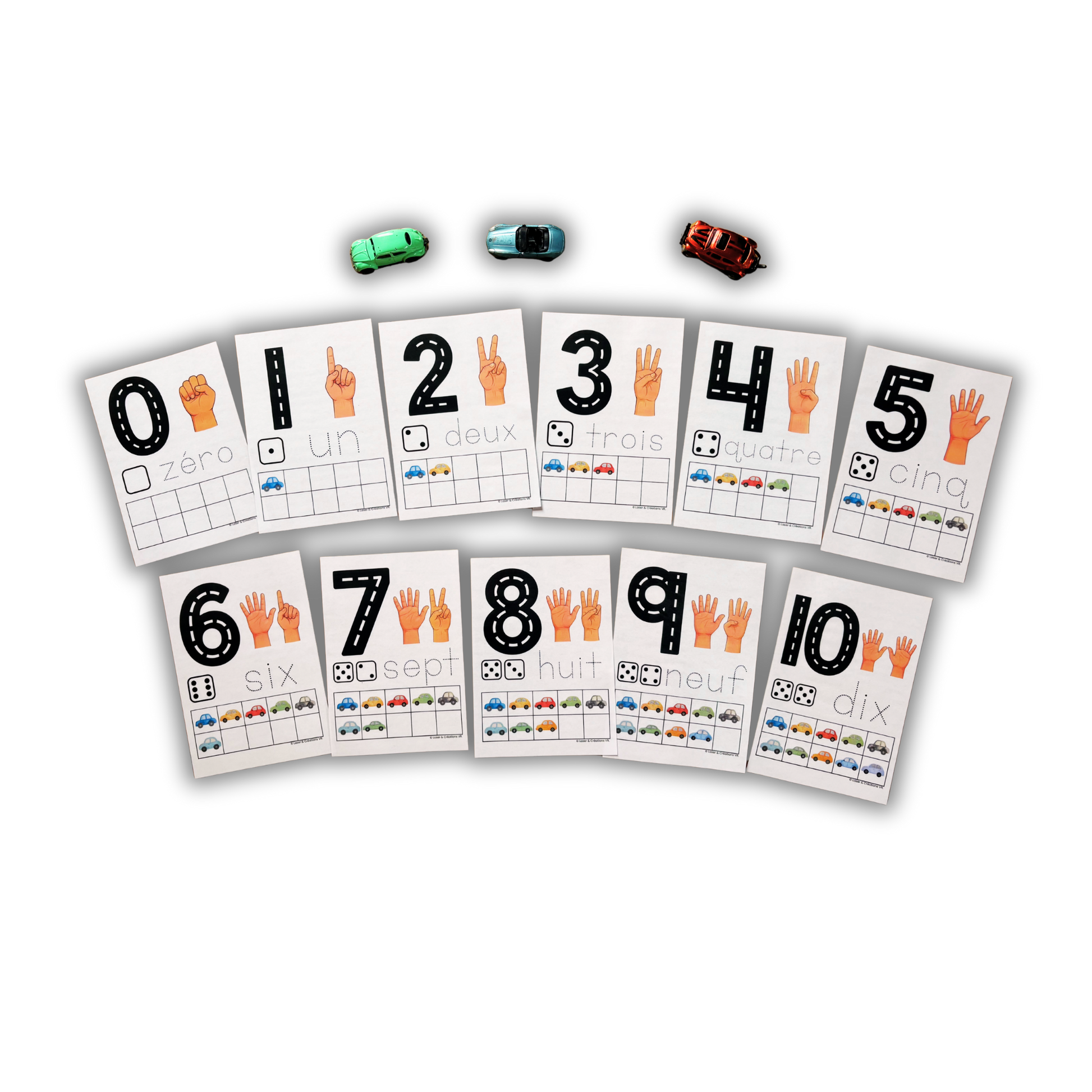 Ce jeu permet aux enfants de 3 à 5 ans de travailler la reconnaissance des chiffres de 0 à 10 en comptant des voitures. Chaque carte propose une scène avec un certain nombre de voitures, et l’enfant doit associer ce nombre à la bonne représentation (main, dé, chiffre).